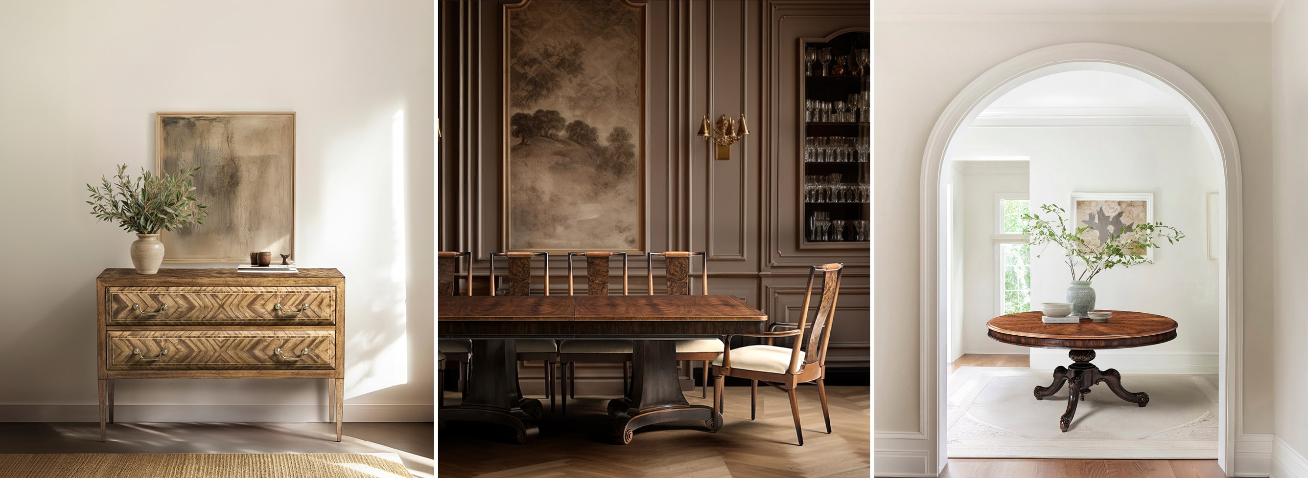 Step into a world of refined beauty and classic design with the Vermeer dining table. Its elegant silhouette, intricate detailing, and luxurious finish pay homage to the timeless allure of tradition. Crafted from alder solids and crotch cerejeira and acacia veneers, this dining table boasts the perf..